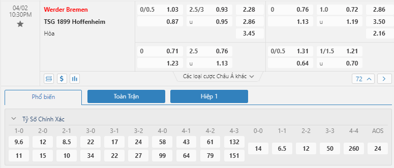Kèo châu Âu cũng đang là sự ưu thế nhỏ cho đội chủ nhà khi mức ăn của Werder Bremen đang là 2.28 trong khi đó con số này của Hoffenheim đã là 2.86. Sẽ là một trận đấu với thế trận tương đối giằng co khi cả hai đội sẽ sẵn sàng chơi sòng phẳng với nhau để tìm kiếm kết quả có lợi cho mình. Không loại trừ về một khả năng bất phân thắng bại giữa hai bên.