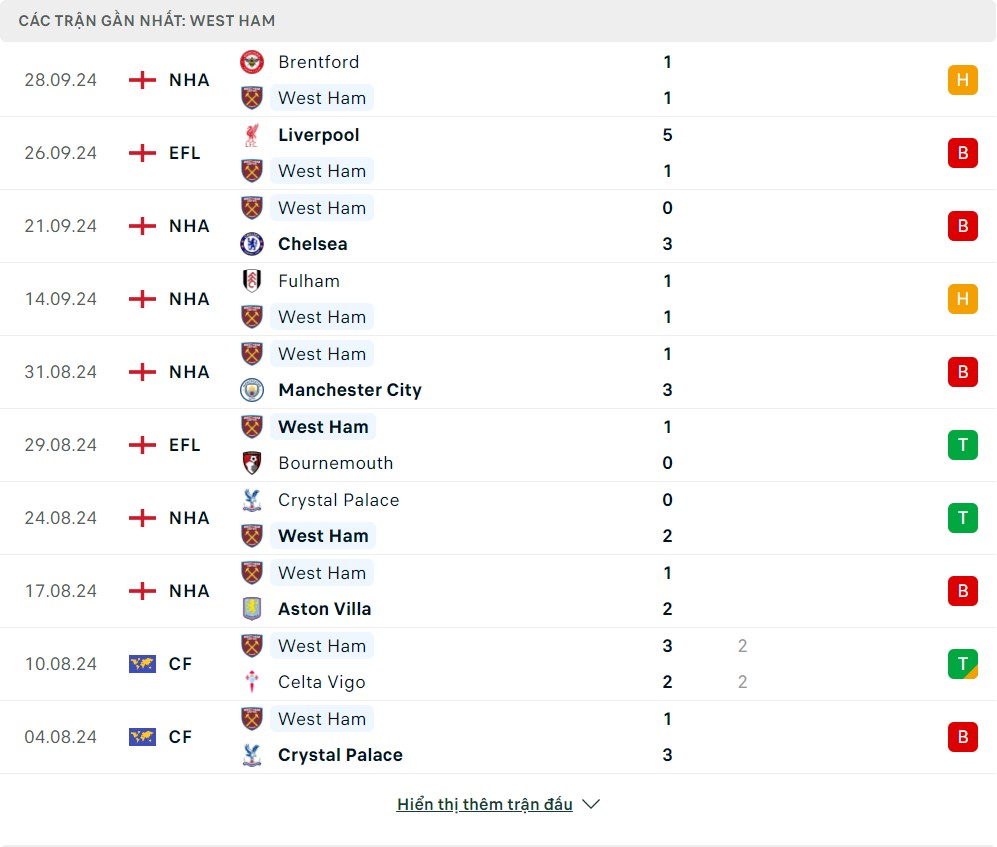 -Phong độ West Ham
