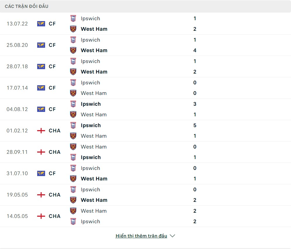 Lịch sử thi đấu của West Ham vs Ipswich