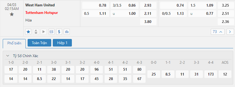 Kèo châu Âu cũng đang là sự ưu thế cho các vị khách khi mức ăn của Tottenham đang là 2.11 trong khi đó con số này của West Ham đã là 2.93. Chắc chắn đây là một thời điểm mà Tottenham sẽ cần phải thể hiện được bản lĩnh của mình, việc vẫn đang duy trì được một phong độ rất tốt giúp cho họ dường như có thể mở ra các toan tính trước một West Ham đầy khó chịu và tìm kiếm lợi thế ở trận đấu sắp tới.
