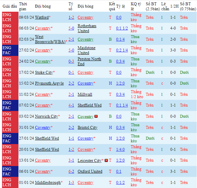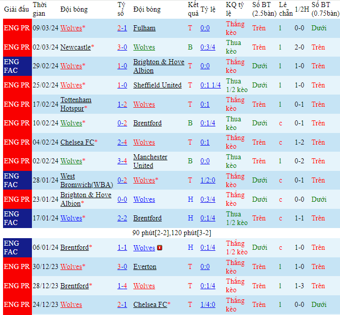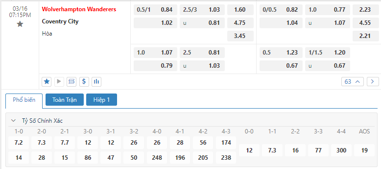 Kèo châu Âu cũng đang là sự ưu thế cho đội chủ nhà khi mức ăn của Wolves đang là 1.60 trong khi đó con số này của Coventry đã là 4.75. Chắc chắn đây là một thời điểm mà Wolves sẽ cần phải thể hiện được bản lĩnh của mình, việc vẫn đang duy trì được một phong độ rất tốt giúp cho họ dường như có thể mở ra các toan tính trước một Coventry đầy khó chịu và tìm kiếm lợi thế ở trận đấu sắp tới.