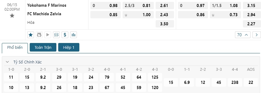 Bảng tỷ lệ kèo bóng đá trận đấu Yokohama FM vs Machida Zelvia