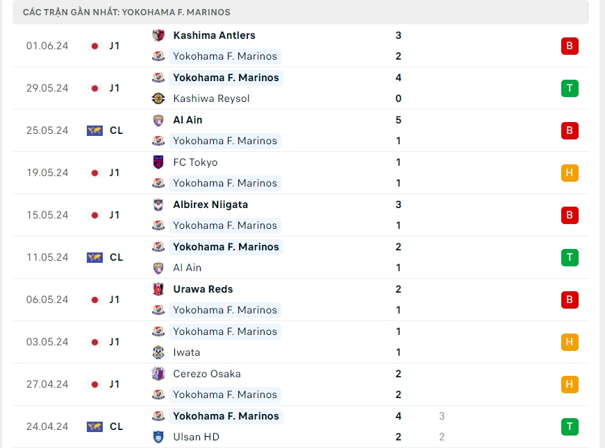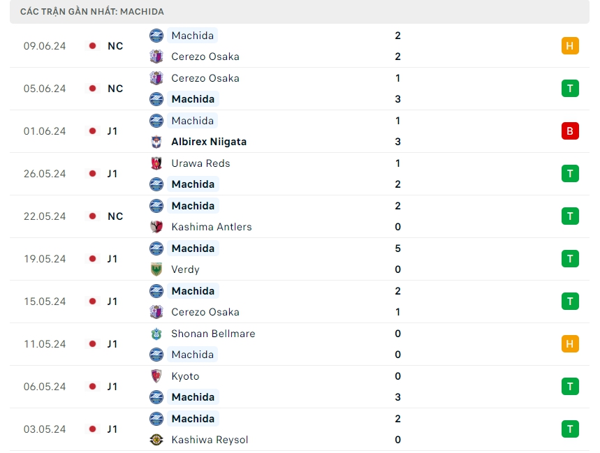 Phong độ đội bóng Yokohama FM vs Machida Zelvia